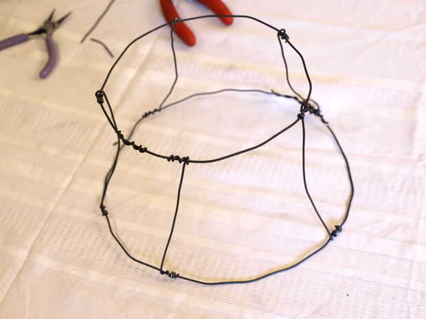 2. lo siguiente que hice fue construir un cuello. Usé 4 longitudes iguales de alambre y había conectado a la base. Yo les había curvado levemente para que no peguen recto fuera de la base pero cóncavo en un poco como un cuello de un animal. Luego hice otro círculo (ligeramente más pequeño que el círculo base) y fijadas a los extremos de los cables del cuello.