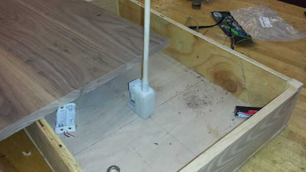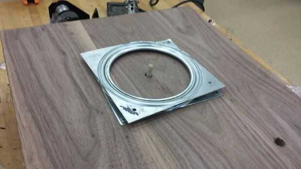 Montar un motor en la parte inferior de la caja. Conectar una barra de pasador al motor. Utilizamos piezas impresas 3D para lograrlo. Asegúrese de que no se sobrecargue el motor por lo que utiliza el voltaje correcto. Conecte un potenciómetro para controlar la velocidad del plato giratorio. Esto será necesario porque el registro de tamaño diferentes requieren diferentes velocidades. Cortar una placa circular de 12 pulgadas y perfore un agujero en el centro de la espiga. Utilice una bandeja giratoria para apoyar la placa y mantenerlo girando más fácil.