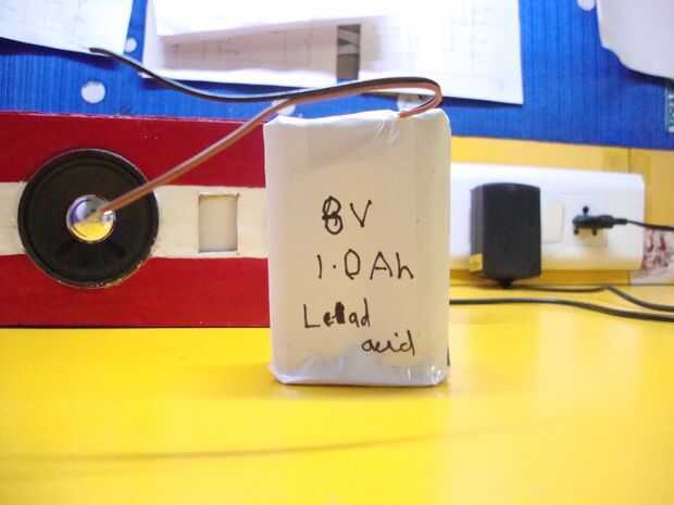 Usé un 8v 1.0ah batería recargable que hice con dos 4v 1.0ah baterías conectadas en serie. Puede utilizar cualquier tipo de batería de 9v a li-ion y de ni-mh a alcalino. Conecte todas sus baterías y fuentes de alimentación a un enchufe de adaptador macho para que se puede conectar a los altavoces fácilmente.