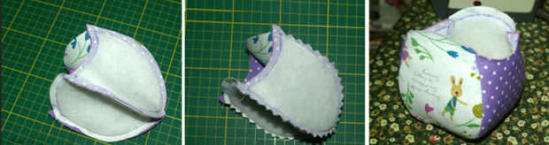 Coser los cuatro pedazos de la tela juntos, alineando en los lugares de arco. Corte los bordes con unas tijeras de diente de sierra. Gire la bolsa hacia el frente.