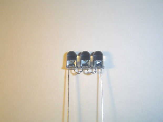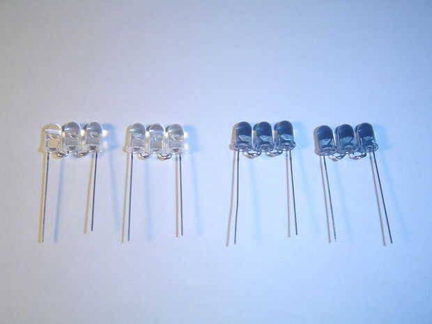 Encontrar el LED de la pila disminuye de piezas. Los 6 LEDs ancho estrecho de la viga de la soldadura en dos grupos de tres (asegurándose de conectar positivo a negativo) y repita con el gran angular LED.