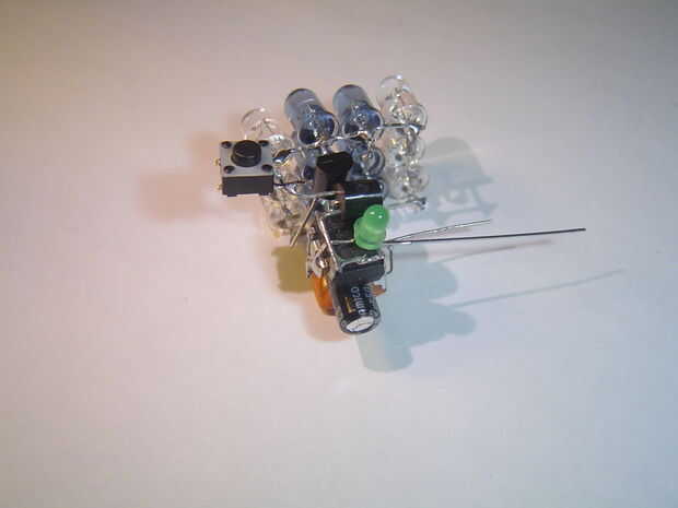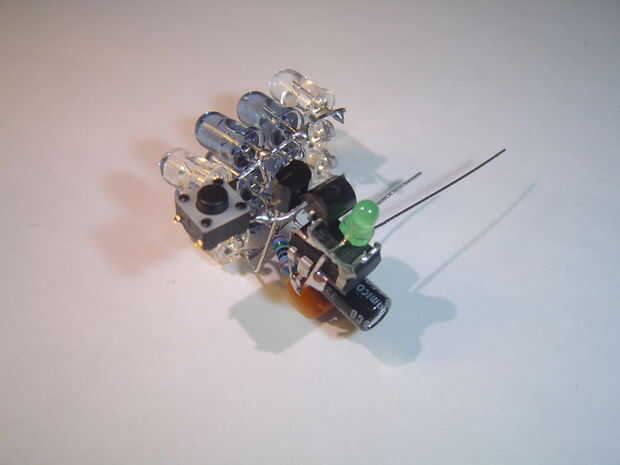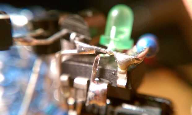 Doblar las dos patas del LED hacia fuera. Colocar encima el microcontrolador y ejecutar el cable negativo por debajo el cable que viene desde los pines 1 y 8. Soldar al pin 7 del microcontrolador.