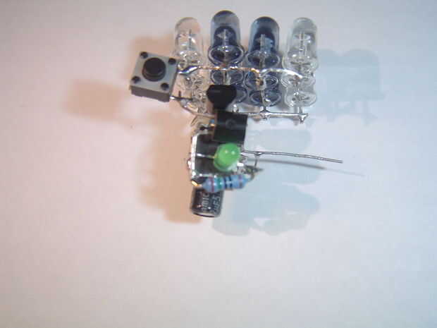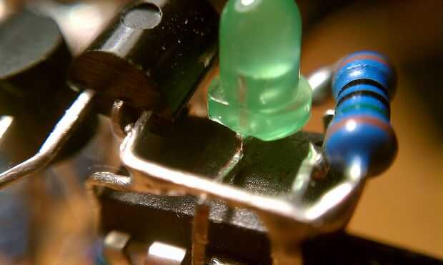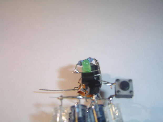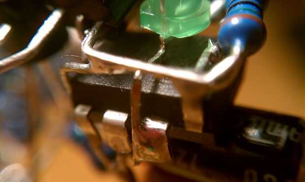 Esta resistencia de 150 ohm limita la corriente para el LED. Soldar un extremo de ella al positivo del LED. El otro extremo alrededor de la curva y soldadura para el mismo clúster como los pines 1 y 8 del microcontrolador. Es donde conecta con energía positiva y los motivos de microcontrolador para encenderlo.