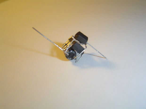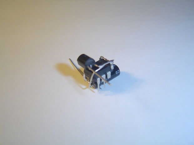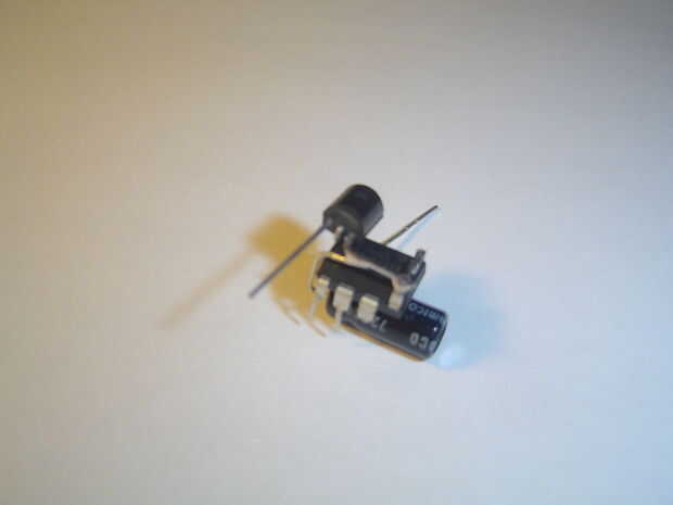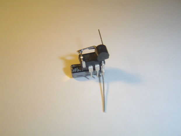 El condensador suaviza los picos o bajas de corriente eléctrica causada por pulsación rápida de los LEDs. Posición en el microcontrolador para que sus conductores enfrentan al lado del regulador. doble el cable de positivo hacia arriba y hacia el lado de 5v (pin 1) del regulador de la soldadura. El extremo negativo al pin 4 del microcontrolador, donde también fue soldado pin 2 del regulador de voltaje de la soldadura.