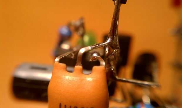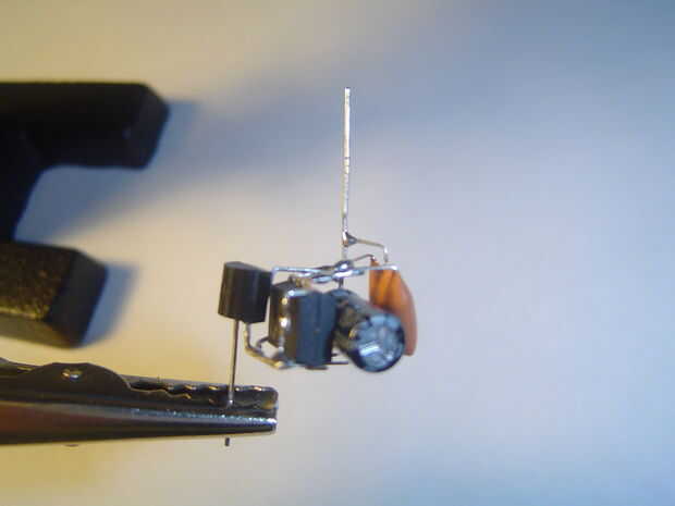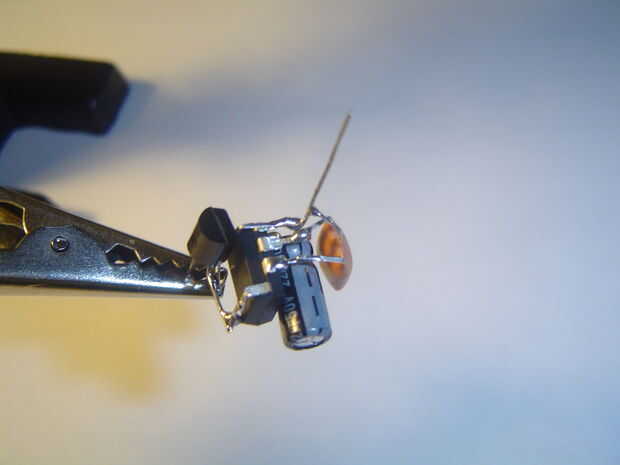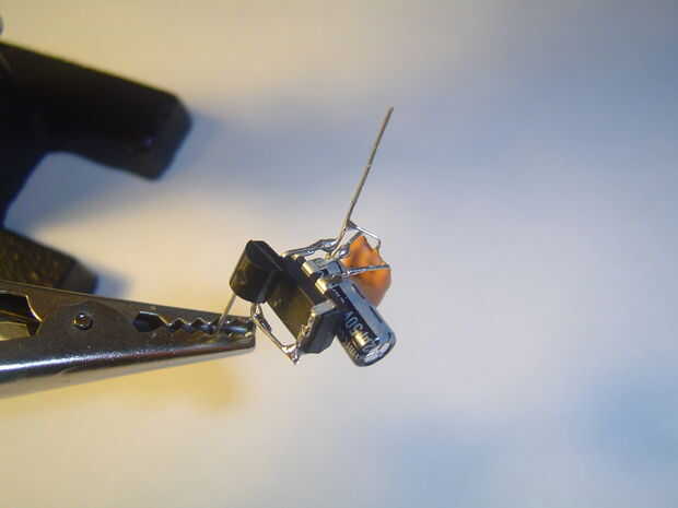 Coloque el resonador bajo el condensador con los cables hacia el sentido contrario como cables de regulador de voltaje. Sus dos clavijas exteriores hacia el interior de la curva y les de la soldadura de los pines 2 y 3 del microcontrolador (las dos clavijas mediados de ese lado). Doble pin medio de resonador para arriba y soldadura para el plomo que se extiende desde el pin 4 (tierra) del microcontrolador.