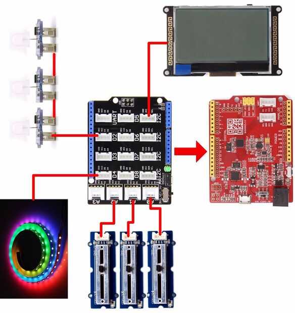 Por último, conectar módulos de Grove a baseshield y fijar las dos piezas de madera con tornillos y tuercas.