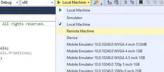 2. a continuación, en la barra de herramientas de Visual Studio, haga clic en el menú desplegable del equipo Local y seleccione el equipo remoto.