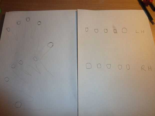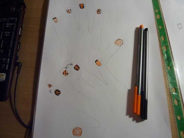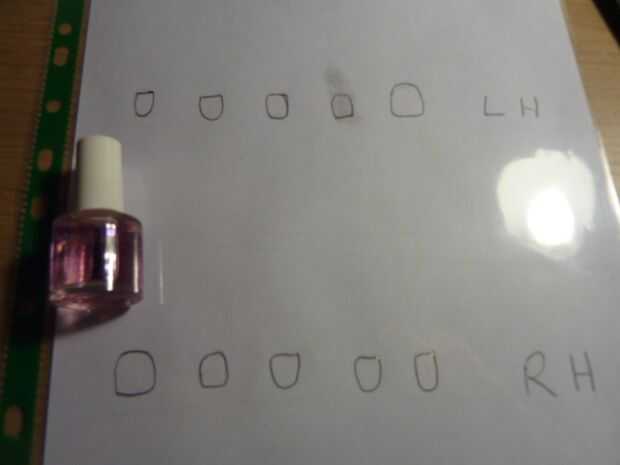 Estimar el tamaño de cada una de tus uñas y luego dibujarlos en un papel. Si desea planificar sus diseños de uñas, entonces hacerlo dos veces. Cuando has sacado el contorno de las uñas, colocar el papel en el monedero de la carpeta y pintar una capa de base donde están los clavos (tratando de no salir de las líneas, pero no importa mucho si usted desea hacerlo). Luego en su otro papel con contornos de clavo en puede planear sus diseños mientras está secando la capa base.