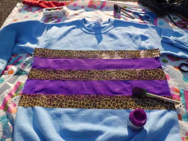 Ahora, agregue la pintura púrpura, usando un cepillo regular o un cepillo de la esponja. Utilizar la cinta para pintar los bordes correctamente. Deje que la pintura seque por completo (30 minutos a 1 hora es una cantidad segura de tiempo de espera). Pinturas para tela son permanentes, así que cuidado con los derrames o manchas accidentales!