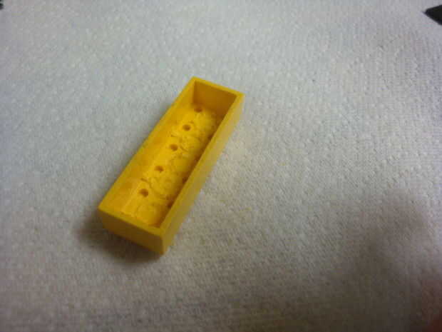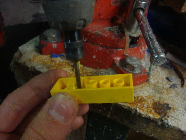 Ahora sacar su dremel o taladro y perfore todos los interiores de su ladrillo de Lego, dejando sólo un "canal" que la unidad.