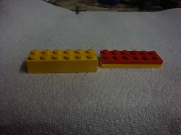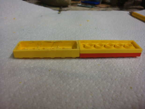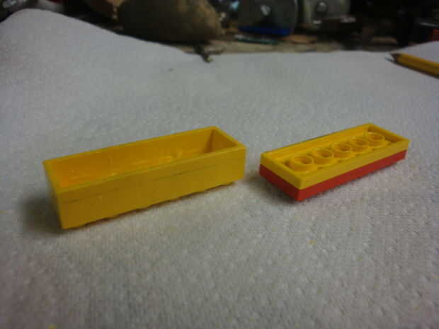 Después de tus Legos interiores te salen vas a lijar hasta el tamaño de dos Legos planas, así que apilar dos Legos planas encima de la otra y trace una línea sobre el ladrillo que vas a afeitar, mira las fotos para obtener más ayuda. Usé una dremel para lijar el ladrillo, en mi primera a se utiliza que un archivo pero que tomó casi una hora. Amost hecho!