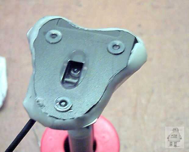 La base originalmente patinado en cuatro etiquetas adhesivos brillantes baratas. Estos se perdieron en la carnicería de la base de ratón. Así que utilicé tres arandelas (desplazable) de nylon pegadas en lugar.
