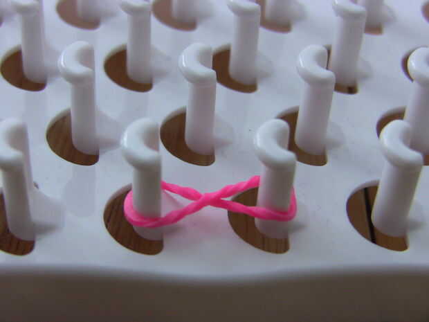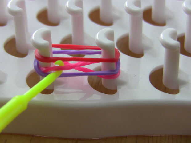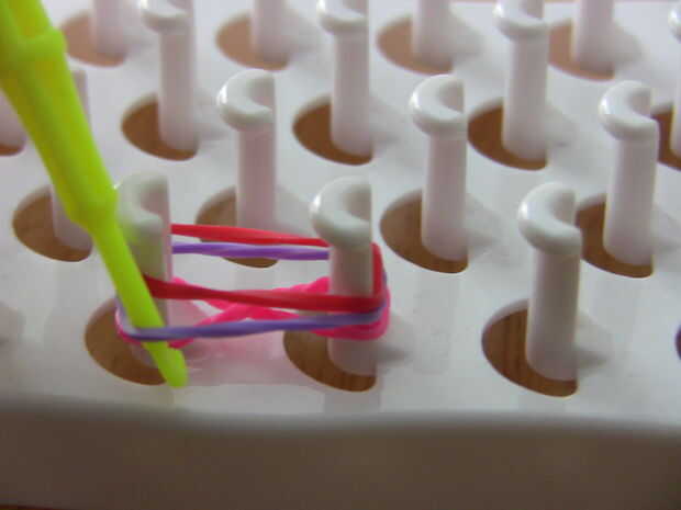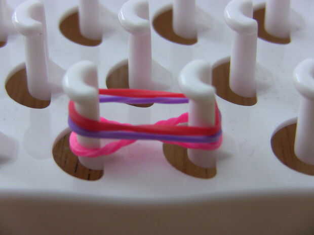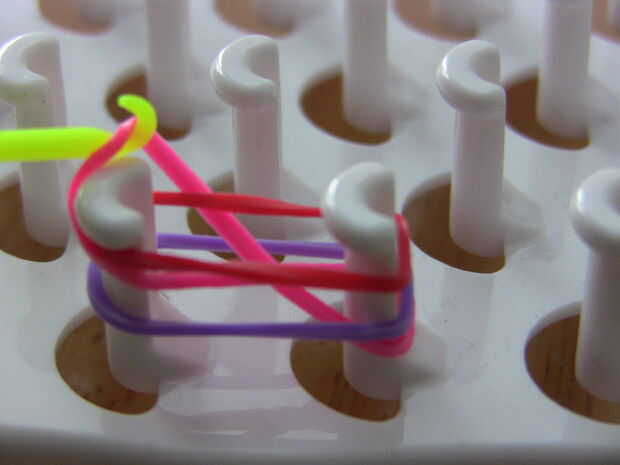 Entonces para las bandas del lazo, tire hacia atrás la banda púrpura con su gancho y agarra la goma rosa y tire de ella hacia arriba y apagado peg y hacer lo mismo en el otro lado de la banda de color de rosa. Haga clic en los cuadrados en los cuadros para consejos.