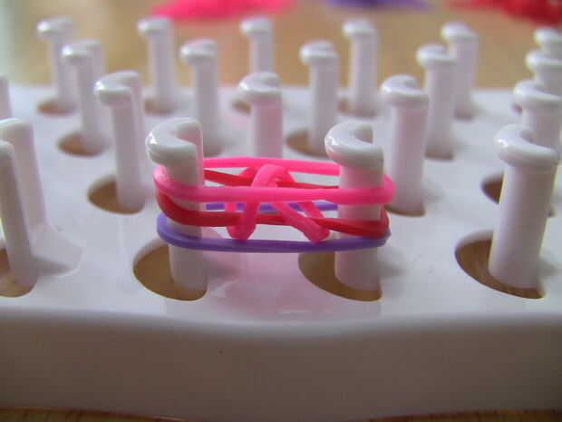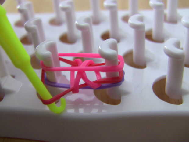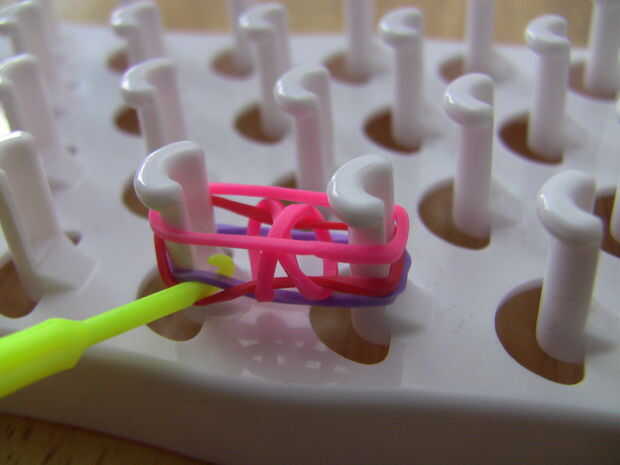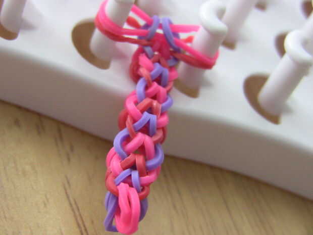 Aquí está cómo lazo apagado otra vez: Tire hacia atrás el rojo y la banda púrpura con su gancho del gancho agarrador. Luego tire de ella hacia arriba y alrededor de la clavija. Simplemente repita al otro lado de su banda de púrpura. Repita este proceso alternando los colores hasta que tu pulsera es la longitud que desee.