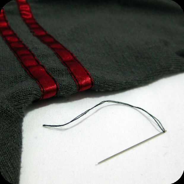 Coser la cinta a lo largo de sus 2 lados. Utilicé hilo negro porque mis parches termoadhesivos tienen bordes negros también.