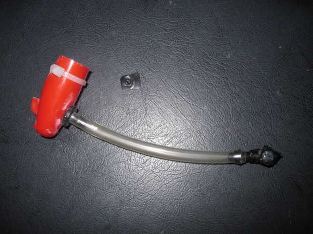 Una vez que el pegamento se haya secado (24 horas) montar todas las piezas.  Conecte la lengüeta de la manguera a la T con un 3 o más pulgadas de longitud de manguera de aire de acuario.  Meter una junta en el tornillo, el tornillo a través de la T y la otra junta.