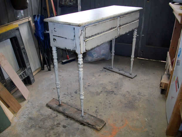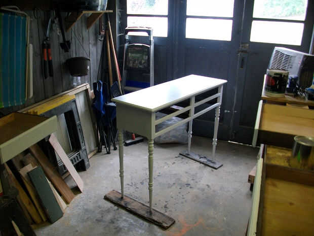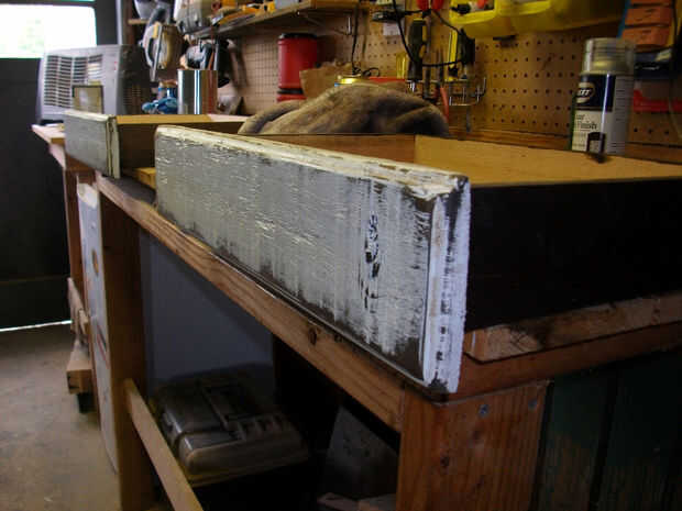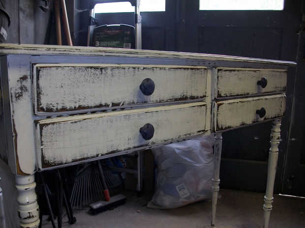 Ahora aplique una capa de la pintura superior. Estoy usando látex blanco cascarón. Permite se seque y ahora ligeramente lije toda la pieza para permitir que el negro mostrar a través de y luego lijar los bordes y lugares que recibirían el desgaste más para conseguir el look gastado usado.