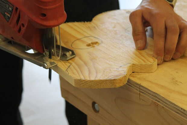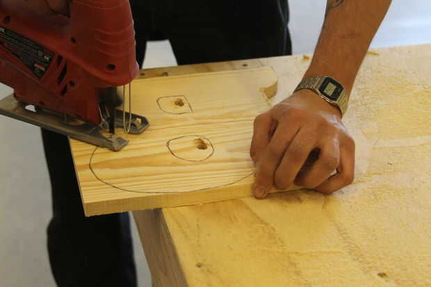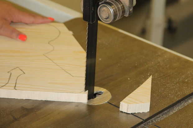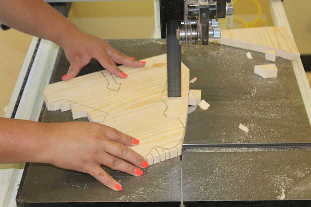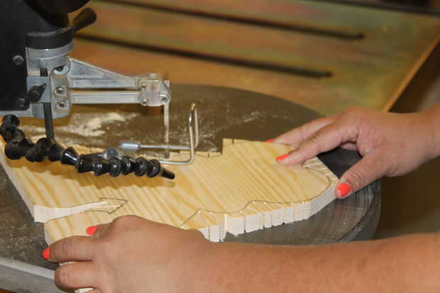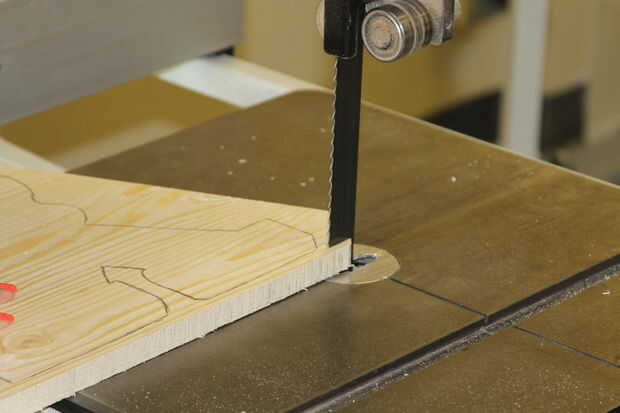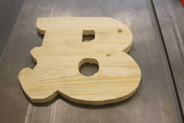 Usé la sierra para cortar el contorno de letras. La cuchilla en su lugar era un poco en el lado grueso, para impedir que la hoja se ajuste, corte muescas en la madera para el contorno de la letra, y luego cortar contra las muescas.