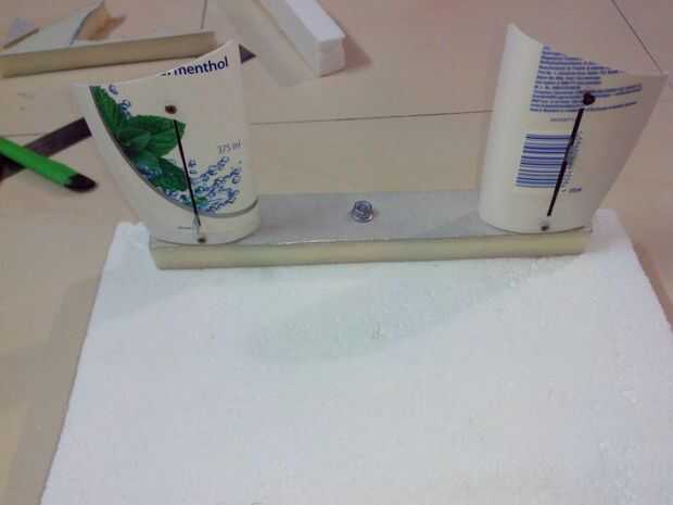 otra vez aquí he utilizado un rectángulo en forma de hoja de panel PIR que se atornilla a un poliestireno normal de color blanco cortado de mi envase de TV. De esta manera he preparado plataforma para frenos acelerador n