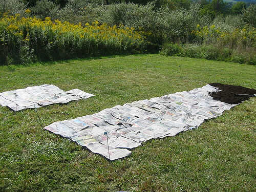 Colocar su periódico por todo el jardín 2-3 hoja gruesa. Llegar a la base de las plantas como sea posible. El periódico con 4-6 pulgadas de recortes de la hierba fresca de la capa. Quiere ver a cualquiera de los periódicos cuando termines. El peso de los recortes debe tener el periódico de ser soplado lejos por el viento (fuerza de vendaval exceptuado).