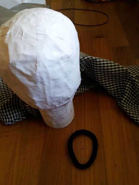 Después de agregar una capa final de papel blanco, tu wigstand está casi listo! Obtener una plaza de tu tela favorita y un hairband/cinta/cuerda (yo usé una diadema elástica)