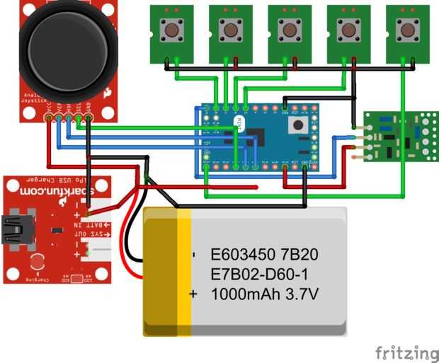Nuestra unidad de receptor está listo. Ahora, es el momento para hacer lo del joystick. Usé un módulo de x-y axis joystick y 5 botones momentáneos para las cosas. La escasez de tiempo me veroboard para la tarea completa pero una placa PCB definitivamente hará más confiable y más hermoso. Creo que una veroboard típica es suficiente. Diseño Fritzing para el sistema completo con el archivo de código fuente se adjunta a continuación.