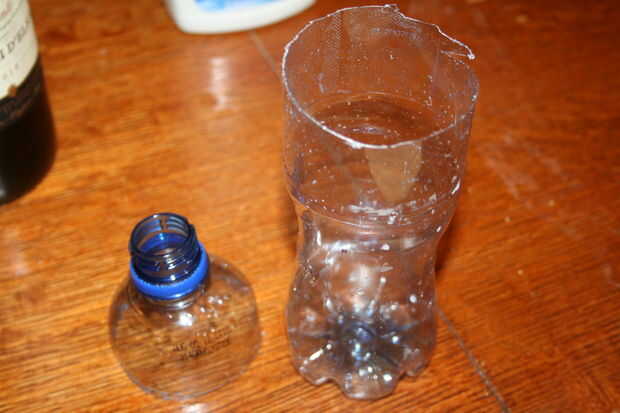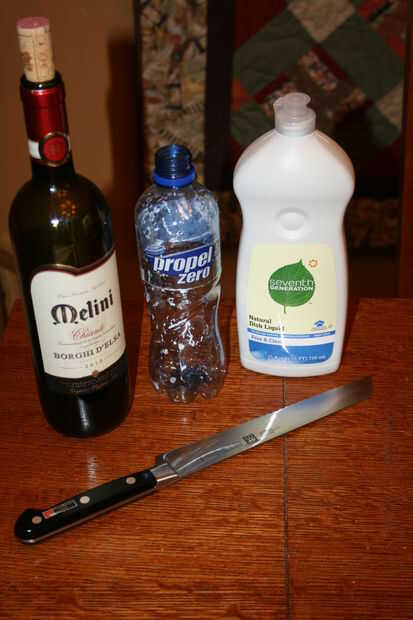 Aquí están las "herramientas" necesarias: vino (prefieren rojo blanco), una botella de agua o soda limpia, un cuchillo de pan o tijeras y líquido lavavajillas. En primer lugar, cortar la parte superior cuarto o tercio de la botella. Añadir aproximadamente 1/2 "de vino y dos gotas de líquido para lavar platos. Ahora voltea que la parte superior para hacer un embudo y coloque tanto como sea posible en botella. Usted es hecho! ¿Ver lo fácil era?