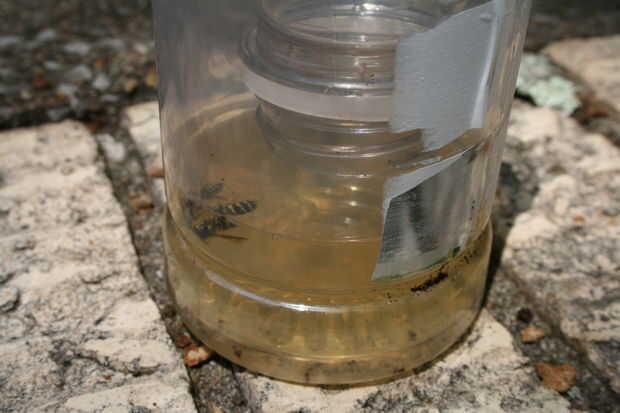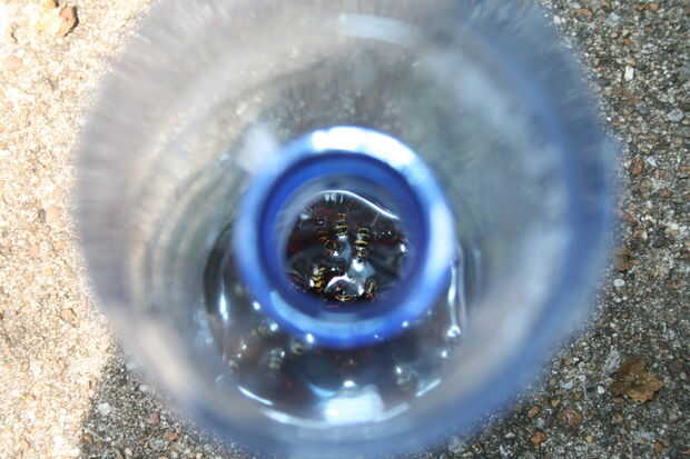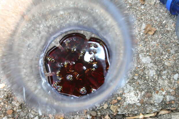 Aquí es difícil (o diversión dependiendo de cómo usted ve) parte. Coloque trampas como cerca del nido de los avispones como sea posible. Puesto que habían construido sus nidos (sí, dije nidos, plurales, pero que explicaré más adelante) en la tierra, simplemente puse las trampas cerca de donde los vi volar. Mi primer escenario estaba cerca de nuestra puerta cerca de una pila de palo. Hice una trampa vino rojo. Como se puede ver, prefieren el vino tinto. Al día siguiente, chaquetas amarillas se habían ido y flotando dentro de las trampas... o así lo pensamos. Aproximadamente cuatro días después de la primera prueba con buenos resultados, una nueva familia debe tener se movió en y picado a mi niño que simplemente venía dentro después de la escuela. Mamá Osa ¡ modo pateado en! Encontré algunos spray bug viejo en el garaje y planeó un asalto a pesar de mi cláusula de plaguicidas NO, pero debe haber sabido lo que tenía en mente porque ellos dispersos. Puesto que no tenemos vino tinto abierto al tiempo, utilicé vino blanco viejo que estaba a punto de ser sacudido y rápidamente hice dos trampas más. Una vez más, al día siguiente, chaquetas amarillas se ahogó!