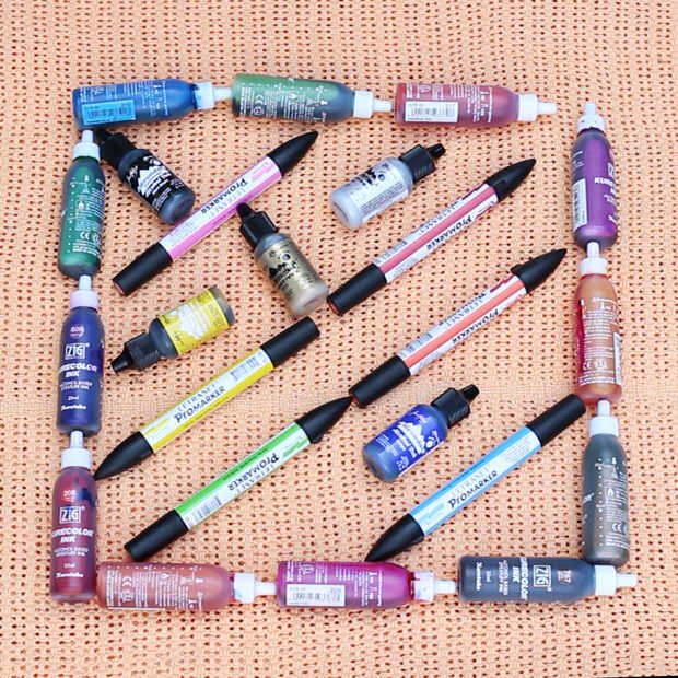 Tintas de alcohol o alcohol tinta basado en marcadores (aunque el resultado será mucho menos intensivo con los marcadores) las tintas utiliza: sistema Zig-Kuretake Kcr-recambios brillante B2 y también Tim Holtz Adirondack tintas - todo de Amazon