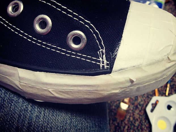 Envolver las partes blancas de su zapato con masking o cinta de pintor. Va a salir mucho más limpio al final!