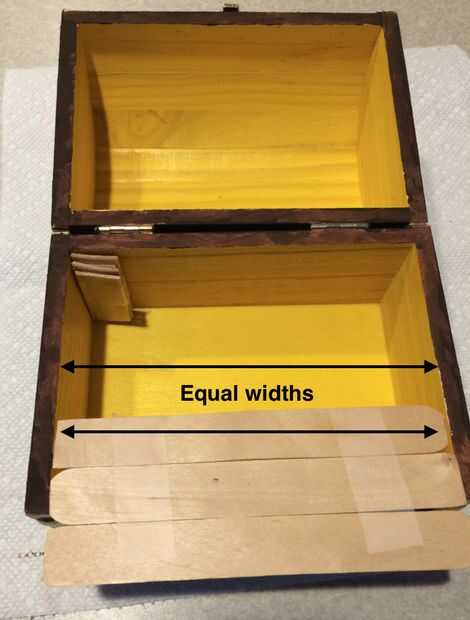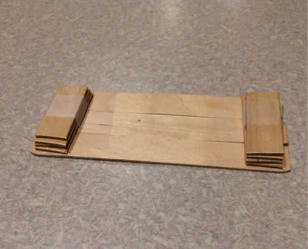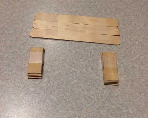 Con algunos palitos , necesita hacer 2 pilas pequeñas que tienen una altura equivalente a la mención del otro palito antes. Estas pilas deben consistir en varios corte palitos apilados encima de uno al otro. Usted tendrá que envolver cinta alrededor de dos pilas para guardarlas de caer aparte. Estas pilas se utilizará como "separadores" para empujar la pared falsa hacia fuera dejando un poco espacio para el altavoz (se iniciará con el altavoz en el siguiente paso). Usted no puede saber cuántos palos posible apilar para arriba, hasta que hagas el siguiente paso.