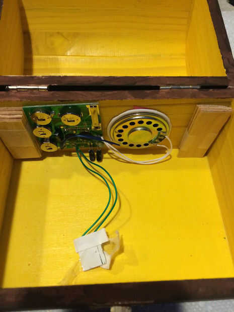 Ahora, deberás quitar cuidadosamente la electrónica de la tarjeta. Puede necesitar tijeras para esto. La ficha que activa el audio también se pueden quitar. Tenga mucho cuidado cuando se corta. Asegúrese de que no cortar los cables! Una vez que han eliminado las partes importantes que usted puede desechar el resto de la tarjeta. Ahora es tiempo para usar la pistola encoladora para pegar lo que habéis sacado de la tarjeta (que debe ser una placa de circuito, un interruptor y un altavoz) en la parte trasera dentro de la pared del pecho, dejando suficiente espacio para las pilas de palo popsicle 2 (mencionado en el paso anterior) para ir a ambos lados. Es muy importante que cuando pegue la placa de circuito, la parte que activado (donde la pestaña utiliza pull) quede hacia arriba.