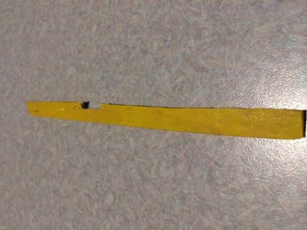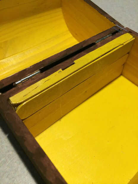 Luego necesitas pintar un lado de los palitos que grabado juntos amarillo (no las pilas). Utilice su pistola de pegamento para unir la parte no pintada de la pared falsa a las partes delanteras de las pilas de palo de paletas que ya están pegadas en la caja. Esto cubrirá la mayoría de la electrónica. Necesita un palito más para ocultar completamente la electrónica. Tendrá que ser cortado por la mitad (mucho) lo que es lo suficientemente pequeño para cubrir la abertura pequeña sobre la electrónica. Una vez que ha cortado al tamaño correcto, necesita pintar un lado amarillo. Antes de colocar esta pieza, necesita una muy pequeña muesca fuera de él. El corte debe ser justo encima de donde está el conmutador de activación en el circuito. Tiene que ser lo suficientemente grande para un pedazo pequeño de papel que quepa y se rompa la conexión eléctrica (como una vez hizo la ficha). Una vez más, las imágenes de este paso ilustran lo que se necesitan.