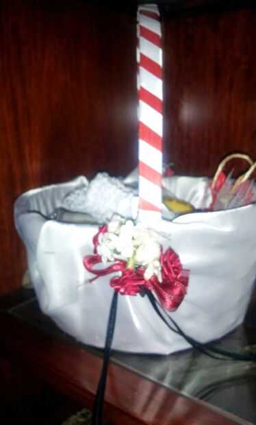 He añadido pequeñas flores, cinta y algunas hojas de brillo a la empuñadura lateral de la cesta y la parte delantera de la almohada. Cosí los extraidos en la almohada.