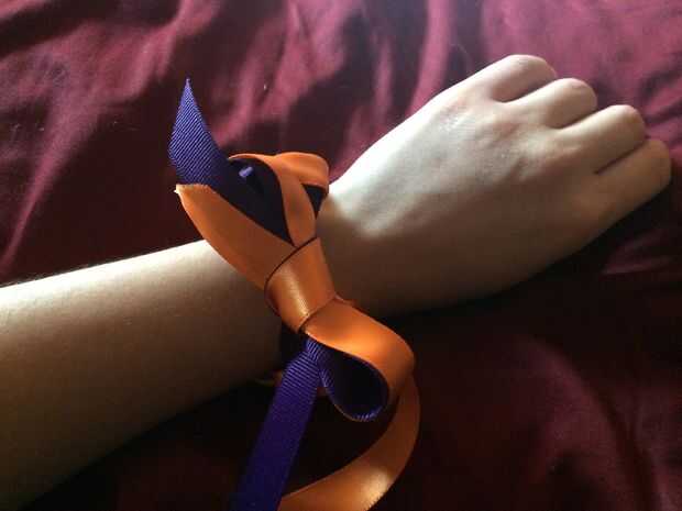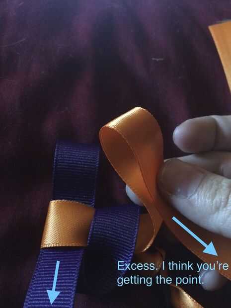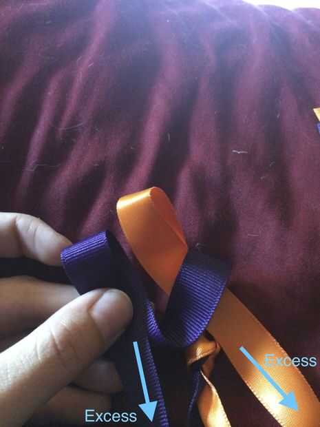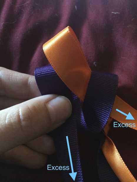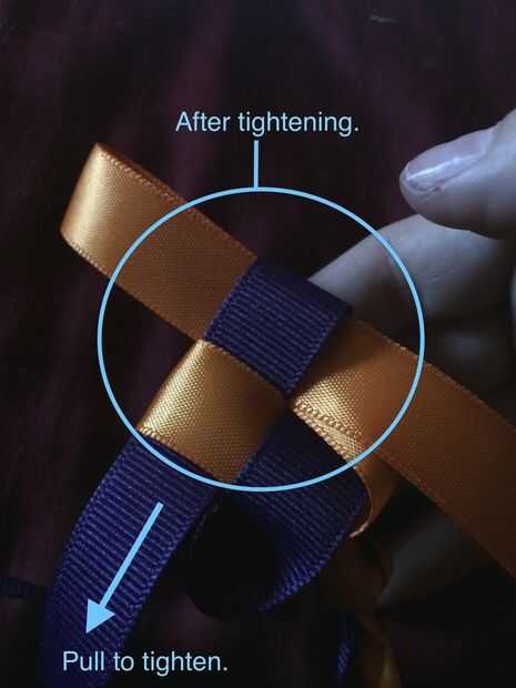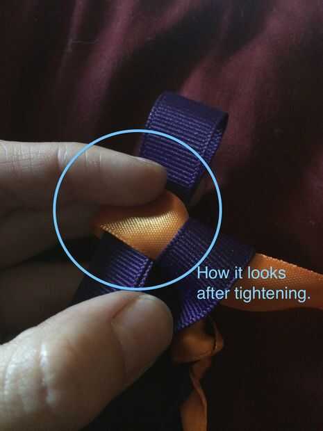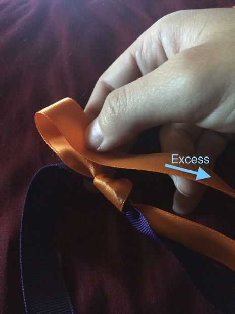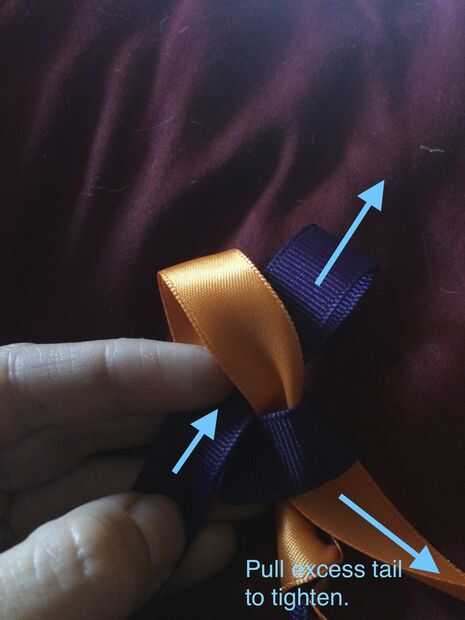 - Apriete el lazo hecho en el paso 2 (naranja) alrededor del bucle que hiciste en el paso 5 (púrpura) tirando de la cola de la cinta sobrante (la cola naranja) que debe colgar de la parte inferior de la pieza comenzó por el nudo que acaba de hacer. Referencia de imagen #7 para un visual.