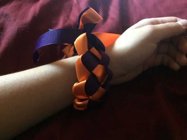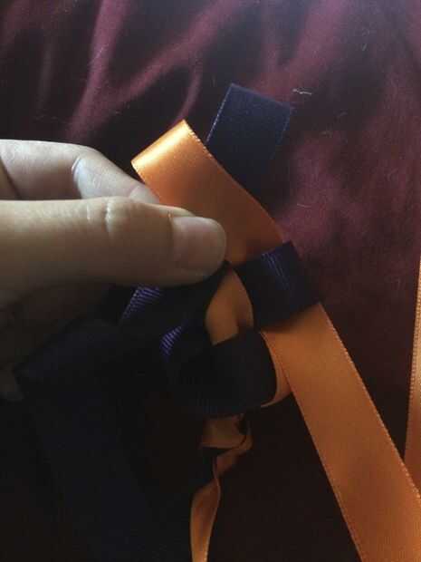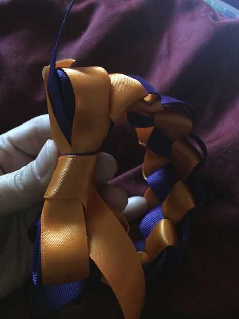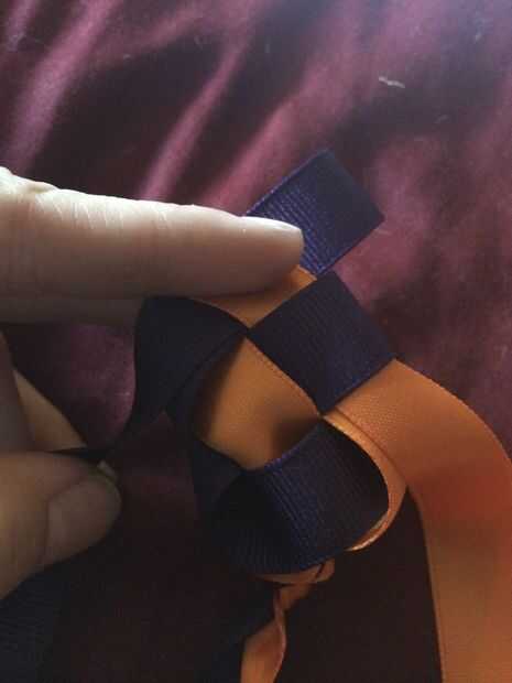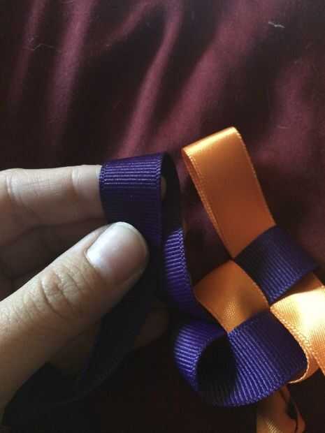 - Para continuar, otra vez haces un lazo con el color contrario (naranja) que usted acaba de hacer un bucle con (púrpura). Imagen #8 para una visual de reverencia.