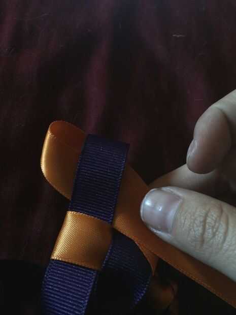 - Aún usando el púrpura cinta, hacer lazo con la cinta exceso doblada hacia usted y en la parte superior como se ve en la imagen #4.