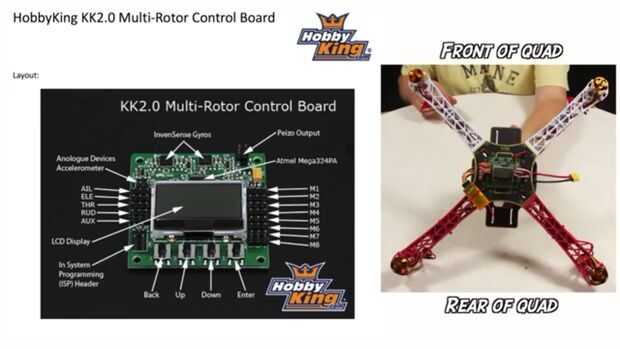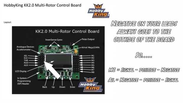 Fijar el controlador de vuelo con velcro en el centro de la placa superior. la flecha blanca es el frente del tablero de la kk2 y que your'e de manera que va a arreglarlo determinará las extremidades delanteras o los brazos de su abejón así que decesion correcta antes de colocarlo. Conecte la señal de salida de alambre en los pasadores de lado derecho de la Junta deben conectarse sus 1er pernos motors o la 1 º fila en controlador y así sucesivamente y el cable negro debe ir fuera de la Junta significa las clavijas más derecha en el controlador de vuelo - cinco terminales para el cable negro debe ir sobre él. Monte el receptor en uno de lo brazo y conecte los cables al receptor y con los pernos del lado izquierdo de la kk2. Generalmente el canal 3 en el receptor será gas, canal 1 = > Elevaor, canal 2 = > roll(pitch), canal 4 = > timón y canal 5 comúnmente Auxillary(aux) pero puede también usar que para controles de la cámara. En Junta de kk 2 clavijas también misma cosas 1ª fila lado izquierdo será para el elevador que controla movimientos adelante y atrás de tu quad y canal 2 significa 2ª fila de pines será para pitch roll que controla los movimientos de lado o las acciones de balanceo de su abejón y canal 3 la válvula reguladora que controla la velocidad de los motores y finalmente del canal 4 para la rotación de tu quad en la posición fija y aux es opcional que estará el canal 5 y usted también puede utilizar para encendido y apagado para el ajuste del nivel de uno mismo.