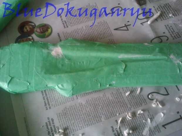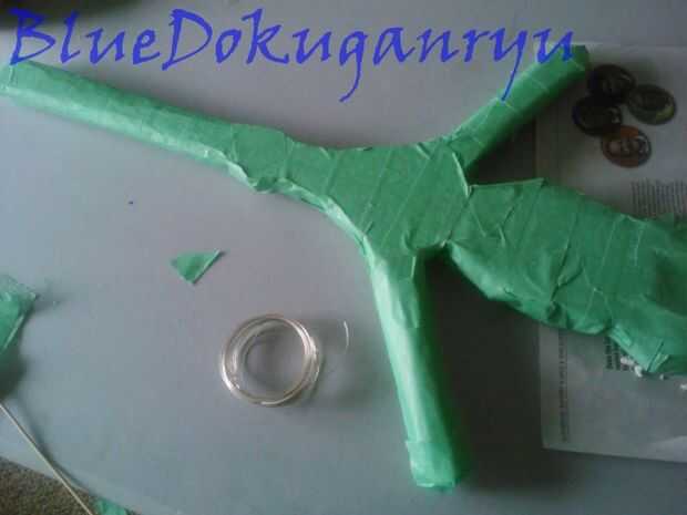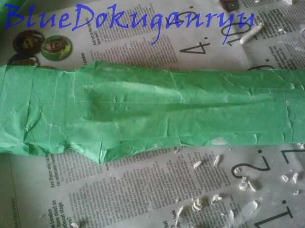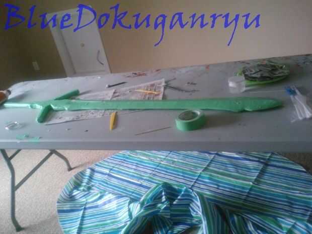 Todo lo que tenía era la cinta de pintor, pero se puede utilizar cinta de enmascarar. Básicamente sólo envuelve la cinta alrededor de la espada de espuma había cubierto todo y mantiene los detalles. Cuando lije lijar algunas partes demasiado tanto para añadir nitidez de detalle más a algunas partes utiliza algunos arcilla de aire seco para esculpir los puntos en la punta de la espada y la parte de guión en la base de la espada. Luego cubrí piezas de arcilla con más cinta.
