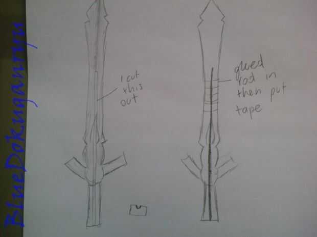 Así que debería haber hecho esto antes, como se puede esperar la espada era demasiado débil en su propio. Primero pensé que de alguna manera poner una varilla de soporte a través de la espada, tal vez por calentamiento y fusión a través, pero era demasiado difícil y arriesgada y no pude conseguir una barra de metal. Así que encontré un viejo poste de tienda que es plástico o fibreglass(?) y ponerlo en el exterior. Lo hice utilizando un cuchillo para cortar una línea de espuma a lo largo de la manija y de la "costilla" de la espada, por lo que sería crear un surco a lo largo de la línea. No tengo fotos de esto pero aquí es un dibujo (triste).