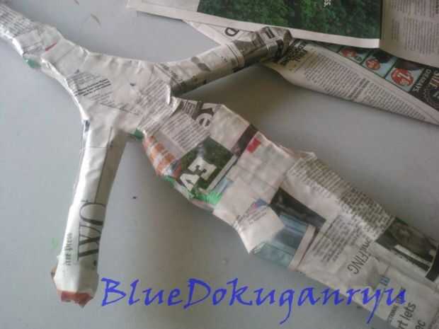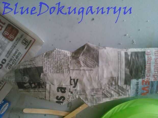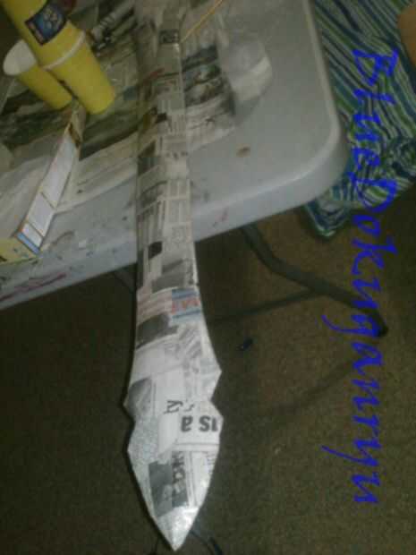 Así que este papel maché consiste en corte de periódico y pegamento. Primero corte su periódico en cuadrados/rectángulos, no demasiado grandes o pequeños. Entonces usted necesita una mezcla de pegamento. Me mezclan algunos cola blanca y pegamento para madera y luego adelgaza abajo con agua. ¡ Prepárate para conseguir sus manos sucias! Así como en el jardín de la infancia vas a mojar el papel en el pegamento y pegarlos en tu espada. Alíselo y difundir algún pegamento sobre el pedazo de papel, así por lo que se queda mejor. Cubrir un lado de la espada, deja secar y luego cubrir el otro lado. Hice una capa pero podría hacer más.