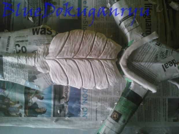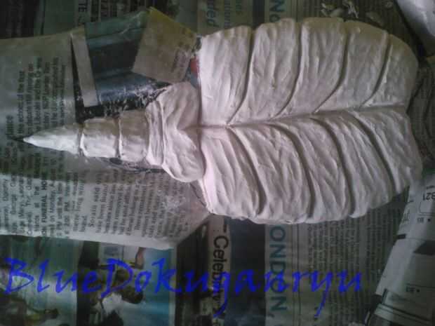 Mientras que el cráneo se secaba, hice las costillas en un lado. Primero lanzó un óvalo sobre menos de un centímetro de grosor, y lo pongo donde las costillas se utilizará una pasta procedente de la arcilla. Para hacer la pasta yo solo molidos juntos algunos arcilla y agua y luego agrega pegamento blanco. Utilizando un cuchillo o herramienta plana, marque el esquema básico de las costillas. Hay cinco costillas en cada lado. Luego definir la forma de cada costilla por el redondeo hacia fuera de donde se encuentran en el medio. Cortar entre las costillas en los lados para que parezcan más separados. Añadir textura con un bolillo. Una vez que estas costillas están secas, dale la vuelta y repita del otro lado. También puede utilizar pasta para pegar en el cráneo.