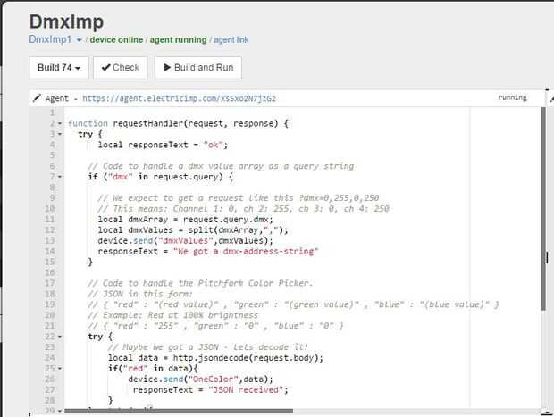 Aquí no mucho nuevo. Un poco de modificación al ejemplo Electric Imp DMX512