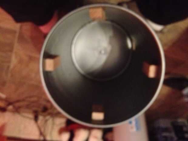 4. Ponga una cubeta superior boca abajo y colóquela sobre el tubo para que los soportes de madera se apoya en el borde del tubo y el borde del tubo se inserta en el desmontaje de tiempo. Otra vez puede que necesite recortar el desmontaje de tiempo para obtener un ajuste exacto.