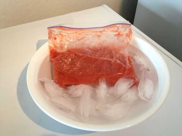 Microondas un recipiente con agua a unos 50-60 grados C (si no tienes un termómetro práctico, busca más caliente que el agua del baño, pero no caliente lo suficiente como para quemar el dedo). Caliente el bolso ziplock de la fruta en el baño de agua caliente durante 10 minutos, luego coloque la bolsa en un baño de hielo durante 10 minutos.