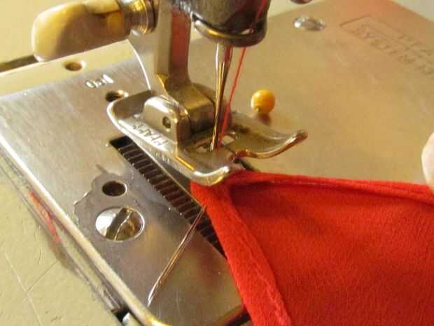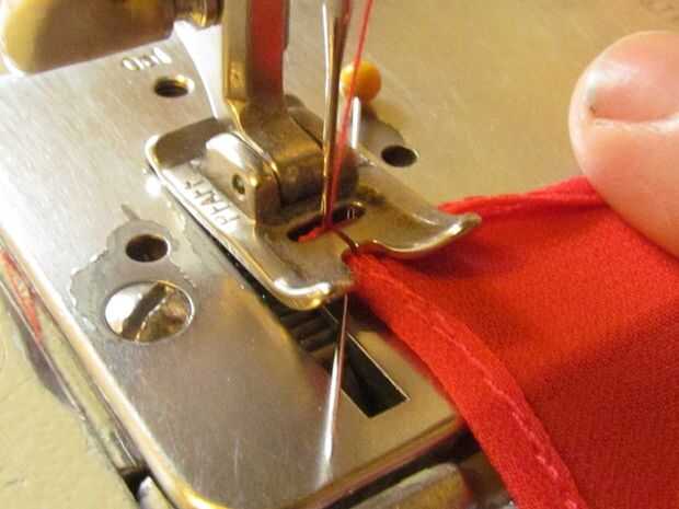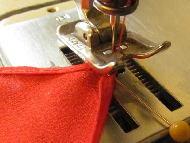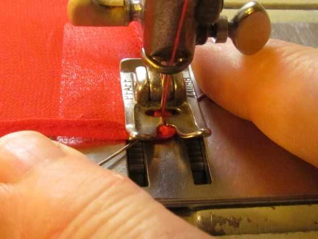 Dejando la aguja hacia abajo, levante el prensatelas, gire la plaza 180 grados. Bajar el pie, tomar dos o tres puntadas hacia adelante según sea necesario para garantizar la esquina. Deje el pasador en su lugar y utilizarlo como una palanca para ayudar a mover la esquina, como ves en la imagen. Utilice la rueda de mano para coser lentamente, facilitando la esquina a través de.