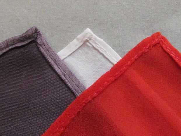 Aquí está una vista del acabado dobladillo Gasa y también muestras de Satén y algodón.