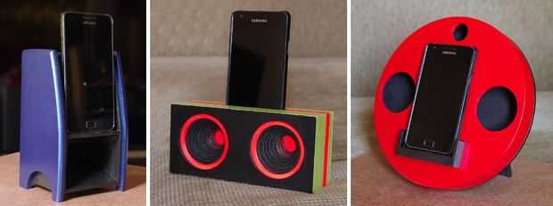 Los tres diseños en comparación se muestran en el cuadro. La izquierda es por supuesto el Cuerno doblado, en el centro un bloque de madera sólido donde se canaliza el sonido del altavoz del teléfono a través del interior de pasajes para dos en forma de cono aberturas en el frente. A la derecha es un diseño hueco, con las superficies grandes de madera contrachapada, la idea es que harán vibrar las superficies, de tal modo amplificando el sonido y dándole más profundidad, casi como un violín o una guitarra.