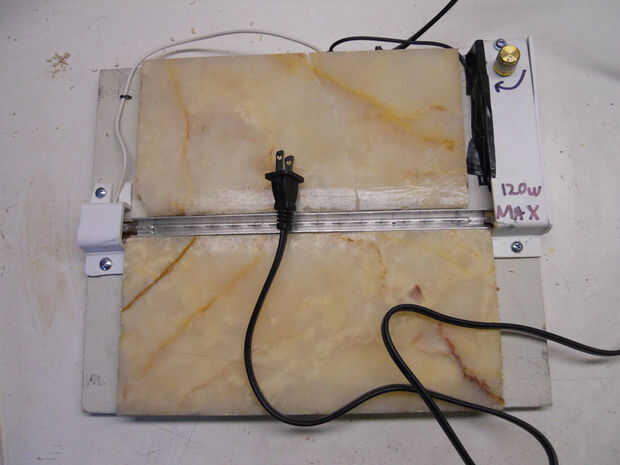Un doblador de calor acrílico simple de una impresora láser antigua, algunos reclamaron azulejos de mármol, una lámpara y algunas otras piezas de chatarra.