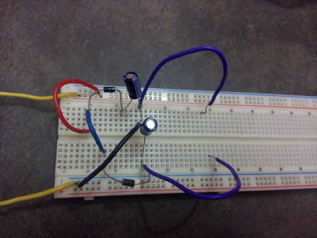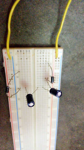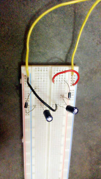 Este circuito doblador de voltaje usa un interruptor DPDT para cargar alternativamente 2 serie conectado condensadores. El objetivo principal de este circuito es ilustrar el principio de funcionamiento de multiplicadores de voltaje de capacitor conmu